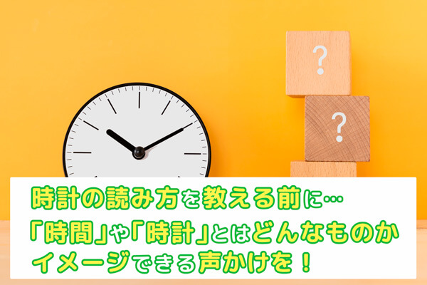 時間を知るには「時計」が必要なこと、「時計」があることで時間の決まりを守ることができることを体感するきっかけをつくりましょう。たとえまだ時計が読めなかったとしても、時計を見たり、触ったりしてみることが大切です。