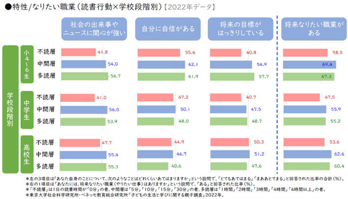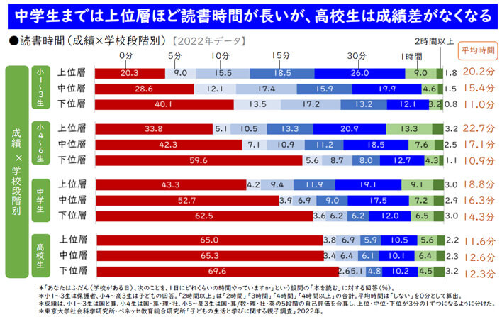 東京大学社会科学研究所とベネッセ教育総合研究所が行った共同調査(※1)によると、中学生までは読書時間が長いほど、成績上位者が多いことがわかりました(図1)。また、読書は、社会への関心や、自分への自信、将来の目標があるといった特性とも相関があるとの結果に(図2)。