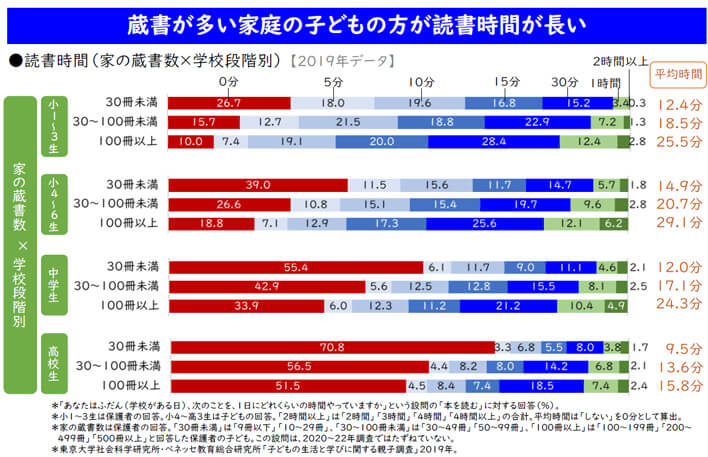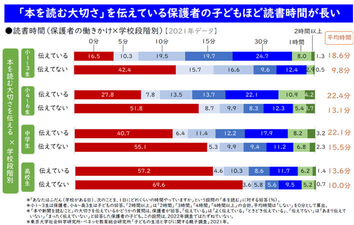 子どもの読書習慣の形成に保護者のかたのかかわりが大きいことも、調査から明らかになっています。蔵書が多い家庭や、保護者のかたが本を読む大切さを伝えている子どもほど、読書時間が長い傾向に(図3、4)。読書に親しみやすくなる環境を用意することや、保護者のかたの働きかけが読書習慣づくりに影響があるといえるでしょう。