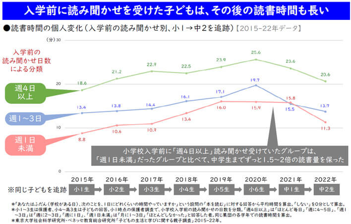 読み聞かせを行うことによる読書習慣への効果は、中学生まで長く続くといえるでしょう。