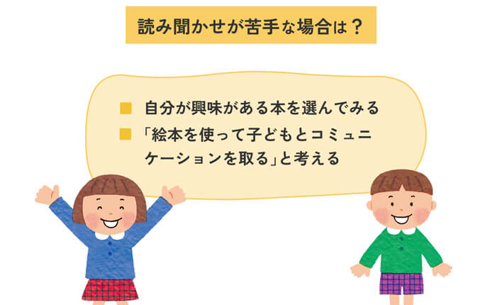 読み聞かせる際は、保護者のかた自身が楽しんで読むことが大切です。子どもは耳だけで聞いているのではなく、五感で聞いています。読んでいる保護者のかたが楽しそうな雰囲気なら、聞いているお子さまもより本の世界に入り込むはず。