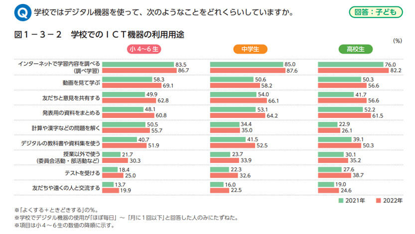 2019年に打ち出された「GIGAスクール構想」によって、全国すべての小・中学校で1人1台端末が配られ、インターネット環境が整備されました。授業でのICT活用も進みつつあり、家庭での利用も含めると、この3年間ほどで子どもがICT機器を使うケースがとても多くなりました(図2)。端末を使った宿題も増え、保護者のかたも、お子さまのメディア利用について心配したり声をかけたりする機会が増えたのではないでしょうか。