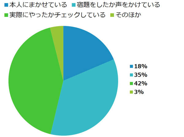 宿題のチェックをどこまでしているか聞いてみたところ、42%の保護者が「実際にやったかチェックしている」と回答。「宿題をしたか声をかけている(35%)」と合わせて、77%の保護者が宿題のチェックをしていることがわかりました(※1)。