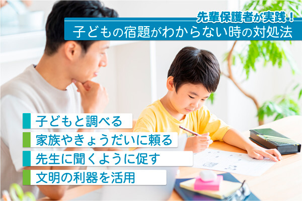 お子さまの宿題がわからない時は、焦ってしまうこともあるもの。全国の保護者のかたの声を見ていると、答えを教えてあげることよりも、一緒に調べたり、質問先をアドバイスしてあげたりすることで、疑問へのアプローチ法を身に付けさせてあげることが大切だと気付かされます。適切なサポートで勉強への姿勢を養っていってあげたいですね。