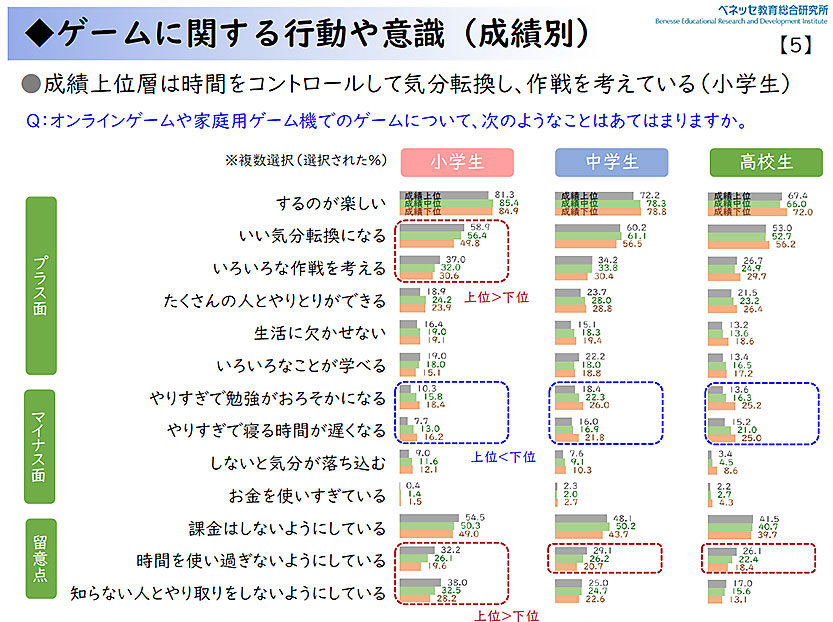 こうした結果から、保護者のかたのサポートで、ゲームと上手に付き合いながらよい効果を得る可能性があるといえそうです。