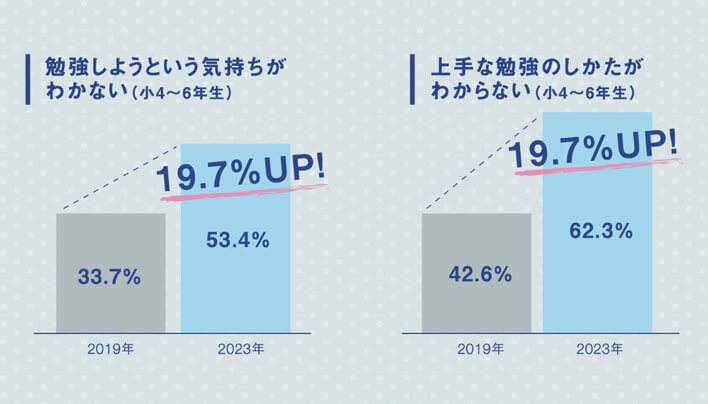 勉強のやり方がわからない小学生も増えています。東京大学社会科学研究所とベネッセ教育総合研究所が共同で行った調査(※2)によると、2023年には6割以上の小4〜6年生が、「上手な勉強のしかたがわからない」と回答。2019年に比べて、19.7%も増加しています。また、そもそも「勉強しようという気持ちがわかない」という小4〜6年生も53.4%と半数以上。そんななか、春休みに「新学年でうまくスタートをきれるように勉強しよう」と言われても、お子さまは何をどう学習すべきかわからず、さらに意欲が下がってしまう可能性もあります。