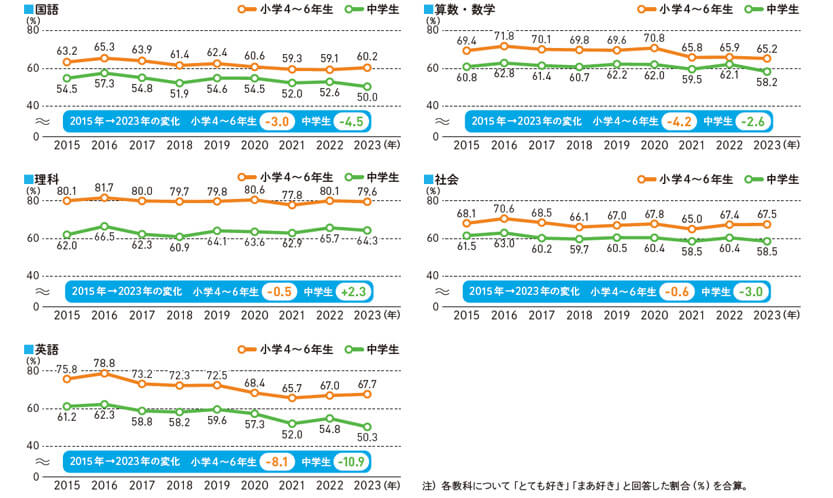 上の図は、5教科それぞれについて、小学4〜6年生、中学生が「好き」と答えた割合の9年間の変化を示したものです。