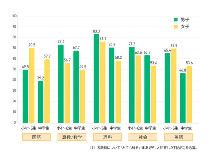 まず、いずれの教科も中学生のほうが小学4〜6年生より「好き」と答える割合が少ないことがわかります。学年が上がるにつれて、学習内容が難しくなることが背景にありそうです。