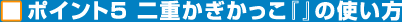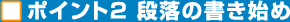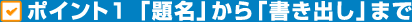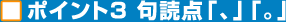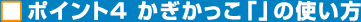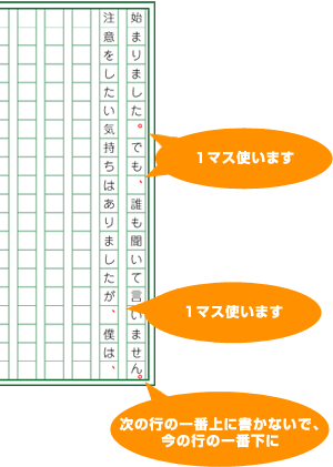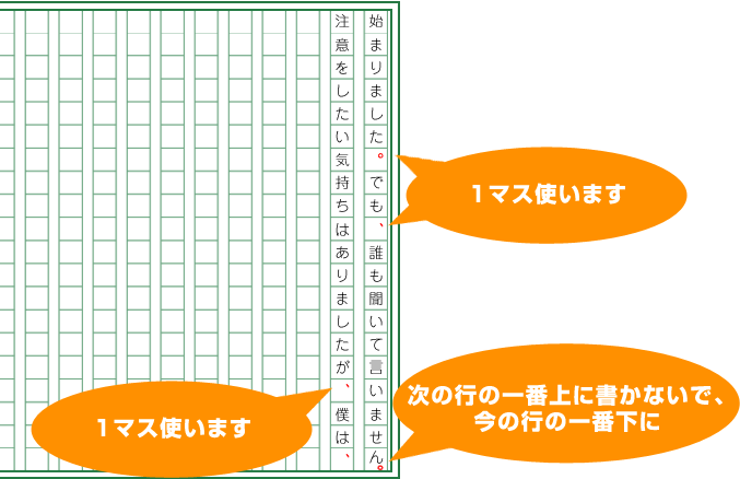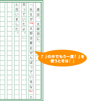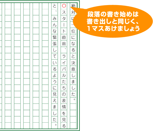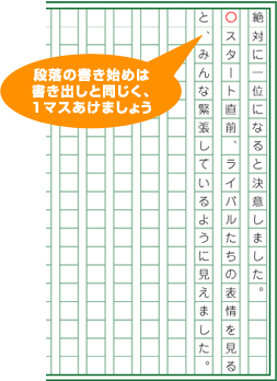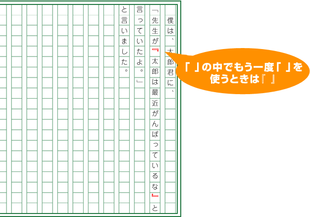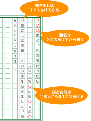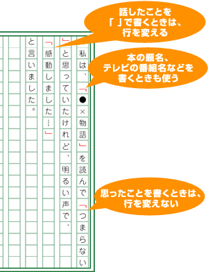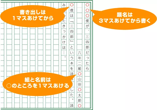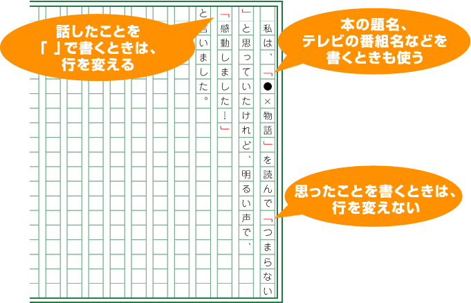3書く 原稿用紙に書く 原稿用紙の使い方のルール 原稿用紙の使い方にはいろいろな決まりがあります。読点や句点の打ち方、題名や名前の書き方などです。これらの決まりを守って書かれている作文は読み手に好印象を与えます。ただ、子どもの作文を見てあげる時、細かく指摘したりするのは逆効果になる場合があるので要注意です。よい部分をほめてから修正をしてあげましょう。 ポイント1 「題名」から「書き出し」まで ポイント2 段落の書き始め ポイント3 句読点「、」「。」 ポイント4 かぎかっこ「 」の使い方 ポイント5 二重かぎかっこ『 』の使い方