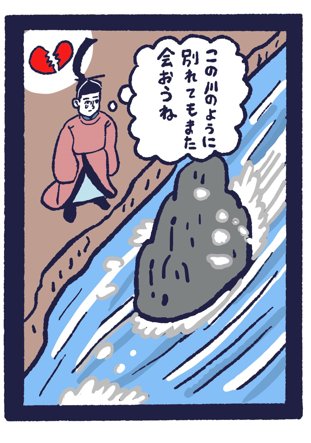 瀬をはやみ 岩にせかるる 滝川の われても末に あはむとぞ思ふ (崇徳院) -