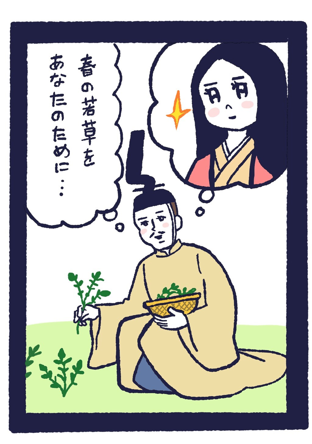 君がため 春の野に出でて 若菜つむ 我が衣手に 雪はふりつつ (光孝天皇) -