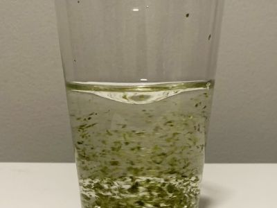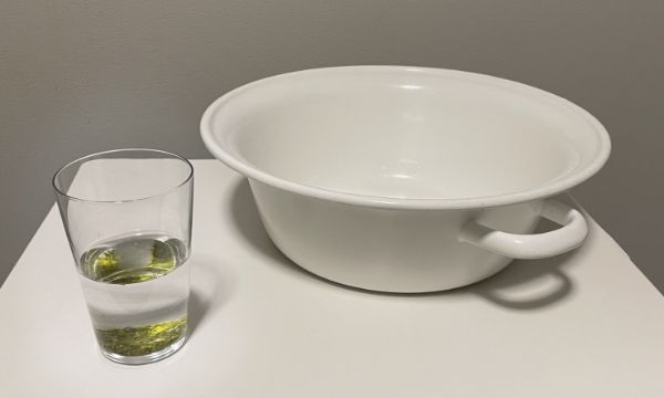 コップに茶がらを入れて、コップの半分くらいまで水を入れる。