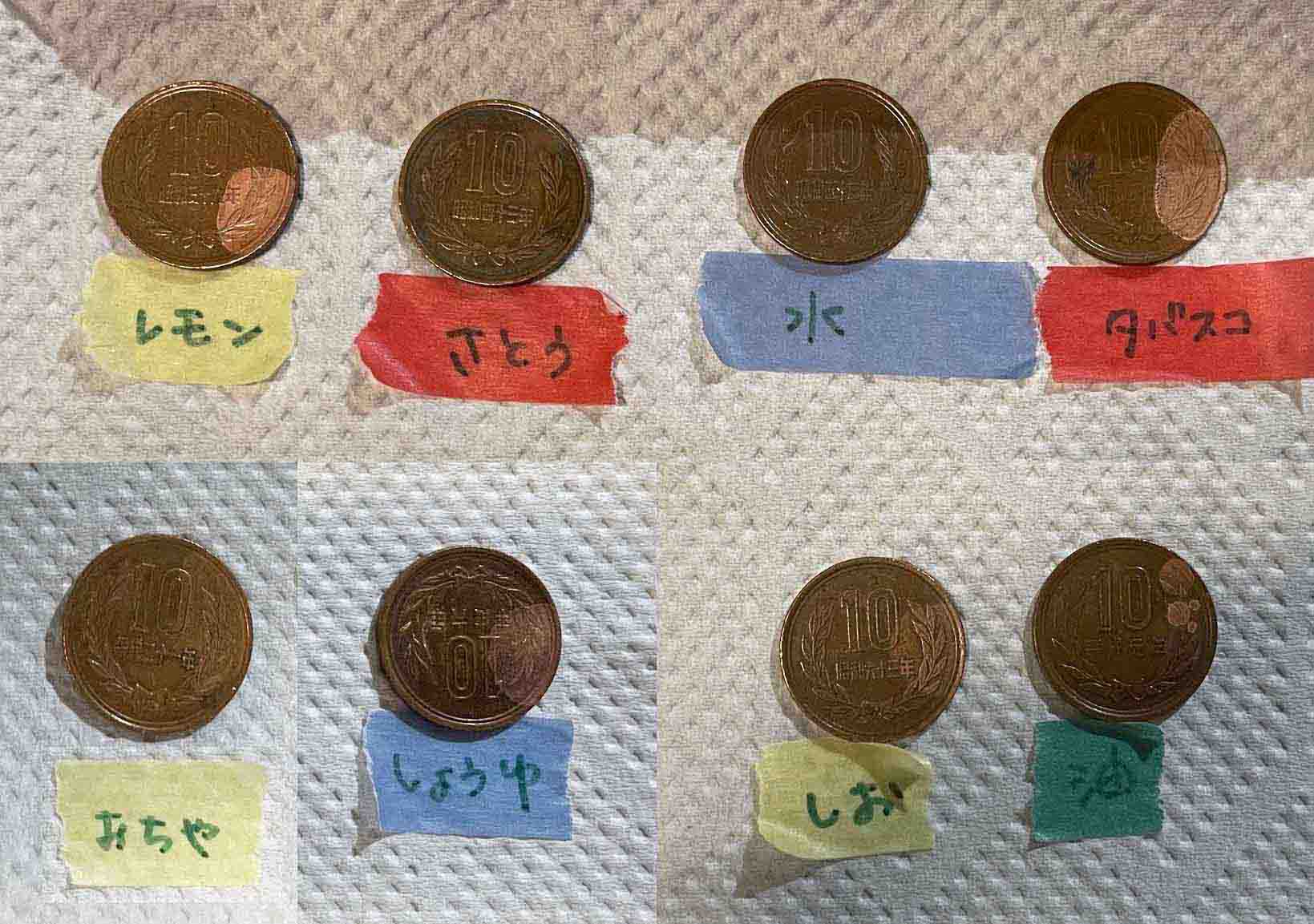ゴシゴシこすらなくても、汚れた10円玉をピカピカにすることができるものがある。いろいろなものを用意して、予想してから実験してみよう。