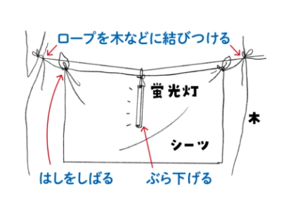 シーツの上にロープをわたし、蛍光灯をぶら下げる。