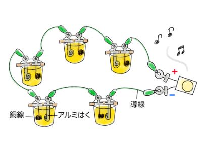 銅線とアルミはくをそれぞれクリップでとめる。銅線(+極)とアルミはく(−極)を導線でつなげていく。最後は LED につなぐ。