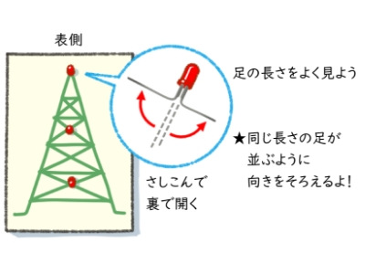 - LEDの足とアルミホイルが密着していないと光らなかったり、光が弱くなったりするよ。上からしっかりおさえてくっつけよう。