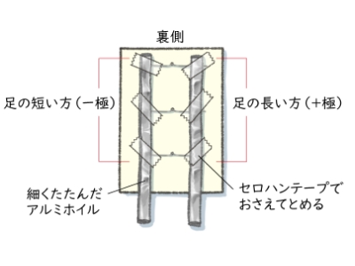 アルミホイルを細長く折りたたみ、リボン状にする。LEDの足の短い方だけを通るようにアルミホイルを置き、それぞれの足とアルミホイルをセロハンテープでしっかりとめる。