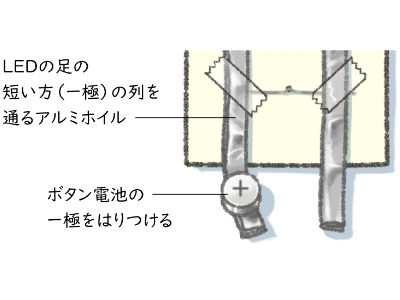 LEDの長い方の足を通るアルミホイルのはしに、ボタン電池のプラス極を付けてセロハンテープで固定する。このとき、マイナス極をセロハンテープで覆わないように注意する。