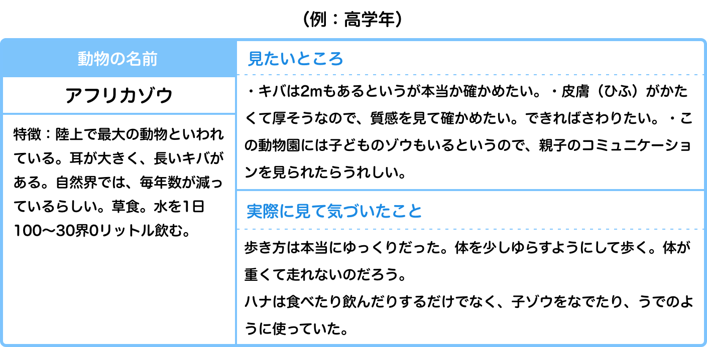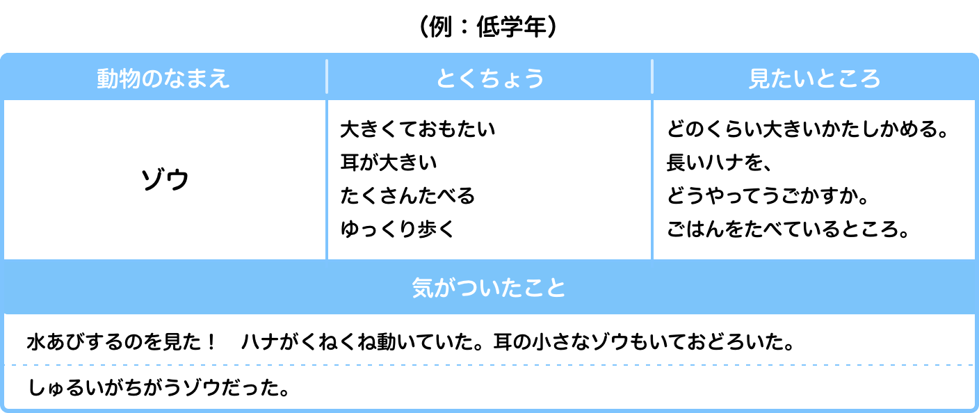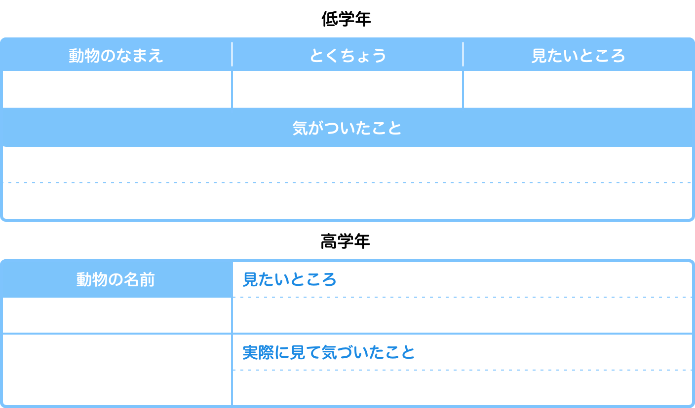【小学生自由研究テーマ No.118】 動物園(どうぶつえん)で動物の観察(かんさつ)をしよう! 動物園に行くきかいがあったら、観察(かんさつ)のじゅんびをしてから出かけよう!よく知っている動物も、ちょっとちがって見えてくるよ。 対象学年 小学1年生 小学2年生 小学3年生 小学4年生 小学5年生 小学6年生 制作日数 1日 3日 1週間 カテゴリ 観察 調べる 用意するもの 動物園の地図 ノート えんぴつ・色えんぴつ カメラ 進め方(準備すること) 1 動物の観察ノートをつくる。 2 インターネットで動物園の地図を用意して、どんな動物がいるかしらべる。観察したい動物がいるところにしるしをつけておく。 3 動物園の Web サイトに動物の名前や特徴が書かれていたら、ノートに書く。その動物について、見たいところ、気になるところを書く。 4 動物園に行って、気がついたことをノートに書く。 まとめ方・提出の工夫 観察ノートの表紙に、観察をした動物園、行った日、天気を書こう。 動物の写真(しゃしん)をとったら、観察ページにはったり、うしろのページにはってアルバムにしたりしよう。写真に、気がついたことを書きこんでもいいね。 思い出して気がついたことや、感じたことを書き足して、ノートをかんせいさせよう。 まとめる時に便利なテンプレートはこちら 発展のヒント 動物園で観察した動物のことを図鑑(ずかん)や本でもしらべてみよう。気づかなかったことや、見たのとちがっていることなどがあったら、ノートに書こう。 動物のずかんを見て、動物園では見ることができなかった動物のこともしらべてみよう。見てみたい動物をあつめて、つぎの観察ノートをつくろう。 画用紙(がようし)や大きな紙に動物の写真 をはって、オリジナルの動物図鑑を作るのもいいね。 共感した 学びがあった 分かりにくい 関連するテーマ 小学生に人気な自由研究ランキング 第1位 ペットボトルで雲を作ろう ペットボトルに消臭スプレーを吹きこんで、ギュッと押したり手をはなしたりすると、中に雲が現れるよ。実験してみよう! 観察 天候 実験 小2 小3 小4 小5 小6 中1 中2 中3 第2位 色が変わる飲み物でキャンディーを作ろう 色が変わるハーブティーがあるのを知っている? 色変わりも楽しい実験で、きれいな 2 色のキャンディーを作ろう。 工作 食べ物 実験 小3 小4 小5 小6 第3位 割れないシャボン玉を作ろう! シャボン玉でお手玉ができるかためす実験だよ。いろいろなもので、シャボン玉が割れないかたしかめて、その理由を考えよう。 工作 実験 小1 小2 小3 小4 小5 小6 小学生テーマ一覧 中学生テーマ一覧 そのほか自由研究に関するお役立ち記事はこちら