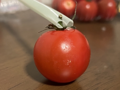 もう1本のペットボトルのフタの上につなげた磁石をはりつけて、ゆっくりトマトに近づける。