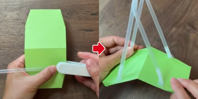 ストローを厚紙の十字の位置にホチキスでとめ、垂直に曲げる。4か所、同じようにストローを付ける。