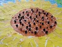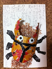 折り紙を一生懸命に細かくちぎって、いろいろな色を使って、クワガタを表現したところ。木は、鉛筆の削りかすを使ったところ