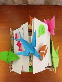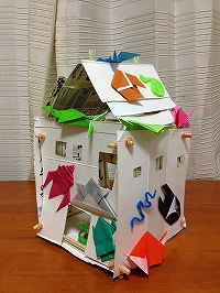学校の図工で使用した残り物や牛乳パックなど、全て家にあった材料で作成しました。何と言っても、ほとんど経費がかかっていないエコな工作がポイント!そして、色とりどりの折り紙で作った生き物達もチャームポイントの一つです。