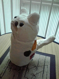 ネコの貯金箱で、口がお金の入れ口を兼ねている。取り出し口も下部にある。