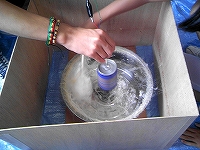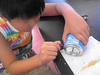 画鋲で アルミ缶の幅2cmの間に細かい穴をあけていくのですが、重ならないように注意深く 粘り強くさしていました。おかげで、細かい繊維の綿アメが出てきて 美味しく出来上がり 苦労の甲斐があったようです。