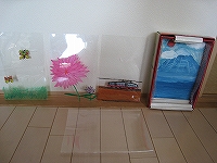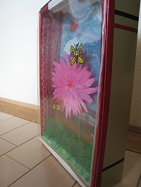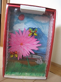 3枚のプラバンを使って、それぞれに絵をかき、奥行きを持たせたところ。蝶が本当に飛んでるように見える。