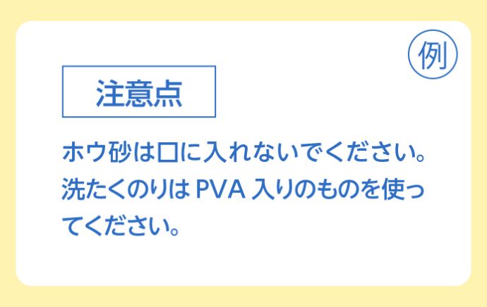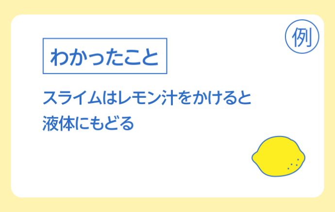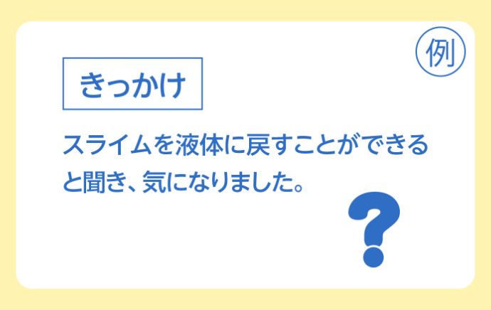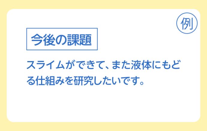 自由研究を見た人が、「自分もやってみたい」と思うかもしれません。例えば「スライムをつくる洗濯のりはPVA入りを使う」など、注意点があれば書いておきます。
