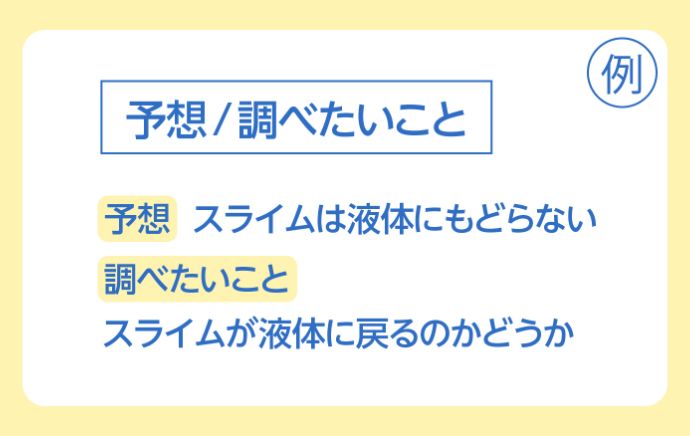 気になったこと、調べたいことに対して「こうかもしれない」と自分なりに予想したことを書きます。それが合っているかどうか、実験・観察で検証します。