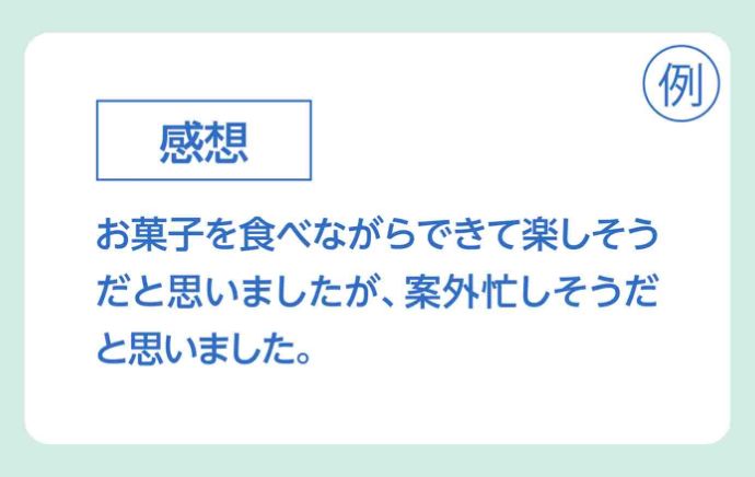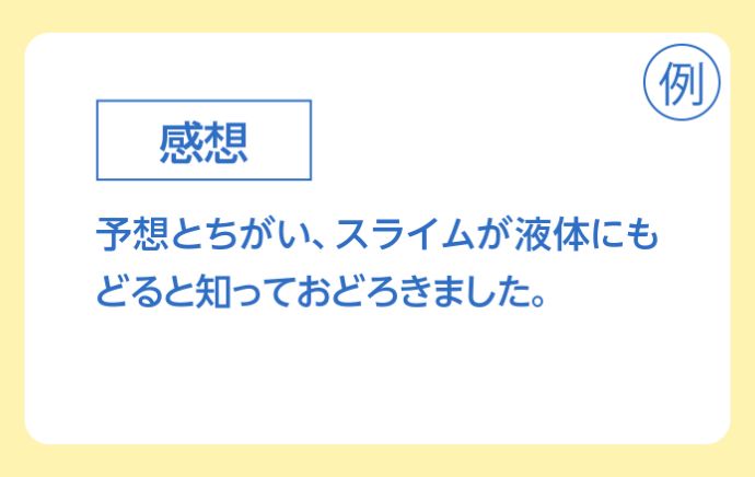 感想を短い言葉でまとめます。実験・観察前の予想と結果を比較して、「予想通りだった」「意外な結果になった」など自分の考えも入れても良いでしょう。