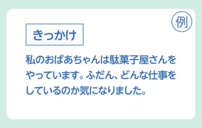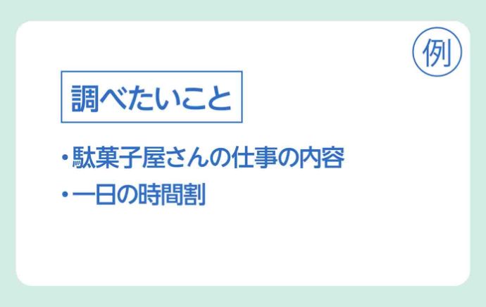 テーマについて、どんなことが気になって、調べたいのかを書きます。例えば「日本の城」について調べるのなら、建物についてなのか、歴史についてなのかなどしぼりこんでいきます。