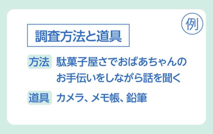 調べたいことに合わせて、誰かに取材する、資料を探すなど調査の方法を書きます。見学に行くのであれば見学先の名称や場所なども書いておきましょう。