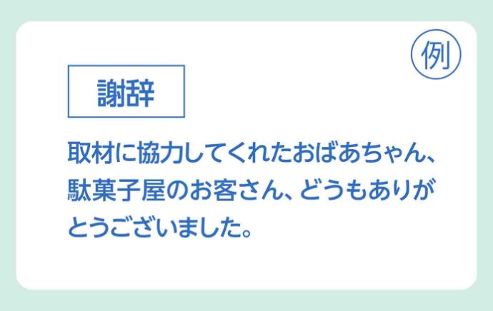 取材時におせわになった人や団体などがあれば、感謝の気持ちを記します。