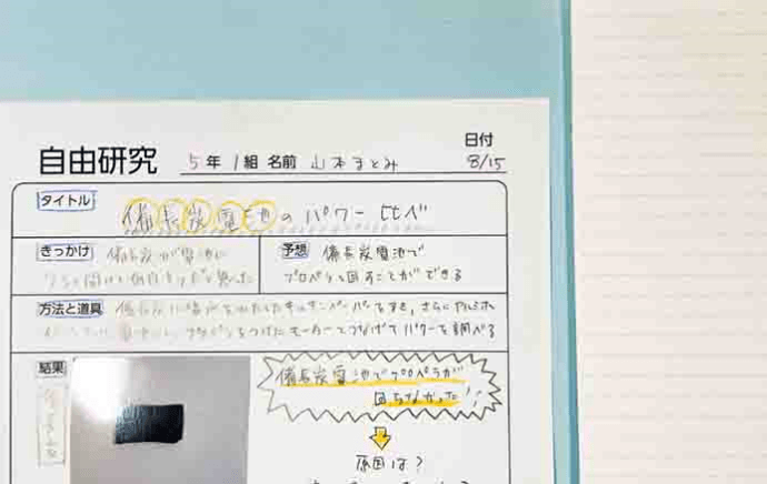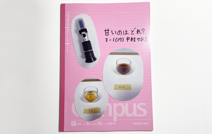 「飲料の糖度をたくさん調べる」など、枚数や項目が多い自由研究をまとめるのにノートはぴったり。写真を貼る場合は片ページごと使いましょう。