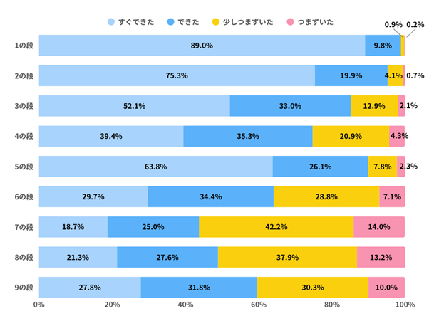 グラフを見ると、「少しつまずいた」と「つまずいた」の合計の割合がいちばん大きいのは「7の段」で、続いて「8の段」、「9の段」になっています。逆に、「1の段」「2の段」「5の段」は「すぐできた」と「できた」の割合が約90%以上です。