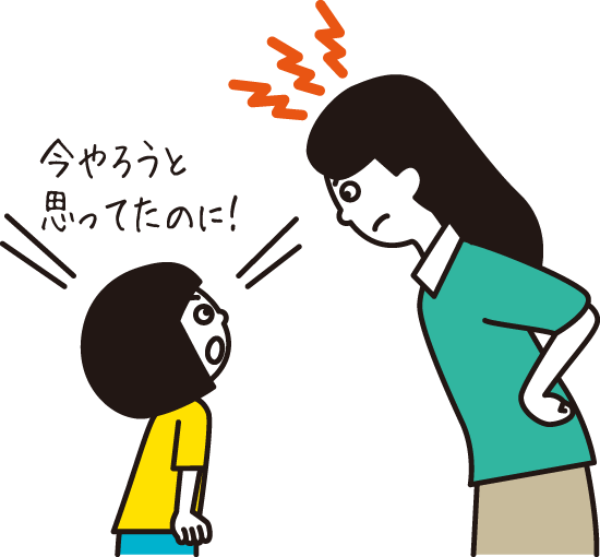 子どもの「今やろうと思ってた!」という反論は、子育てのあるある。でも、子どもは実際に「やらなくちゃ」と考えていることも多いのです。それなのに行動に結びつかないのは、脳の言語を司る部分と運動(行動)を司る部分が異なるからです。頭で言葉を何度反復しても、運動野は働かないので物理的に体を動かすことができません。言葉で言い聞かせても行動には結びつきにくいことを知っておくといいでしょう。