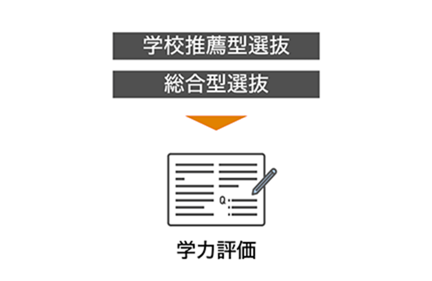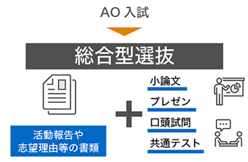 志願者が記載する志望理由書等の書類に加え、小論文やプレゼン、口頭試問等または、共通テストいずれかを必須化し、学力的要素を評価します。