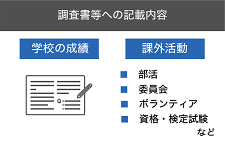 調査書への記載項⽬は、学校の成績のほか、課外活動の実績も含みます。