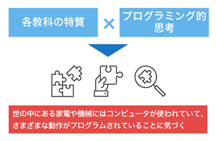 既存の教科の中で、基礎的な「プログラミング的思考」を養うことが主目的です。