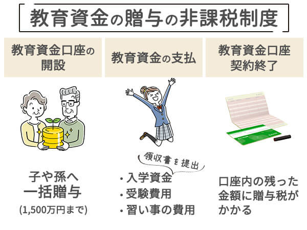 金融機関との一定の契約に基づいた「教育資金口座」を開設し預金すると、その口座のお金を都度教育資金として利用することが可能です。