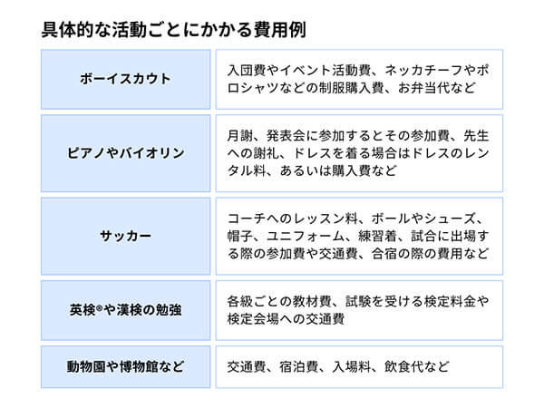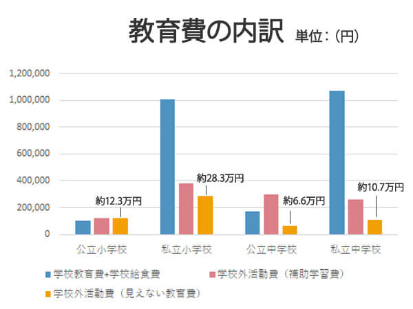 - 学校外活動費:「補助学習費(塾や通信教育の費用など)」と「その他の学校外活動費(学習以外の習い事や体験など)」の2種類がある