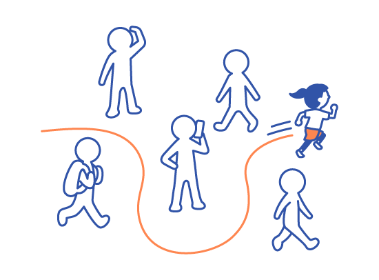 街中で、人をよけながら歩く。よける対象と的確な距離を取り、タイミングをつかんで動くことを意識する。