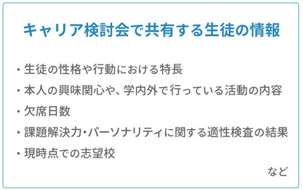 「生徒がさまざまな活躍を見せるようになったことで、偏差値以外で生徒の個性を多面的に理解し、支援することの必要性を実感したんです。『キャリア検討会』では、生徒が何を考え、どんなことに関心があるのかを共有し、それに対するサポート手段を話し合っています。