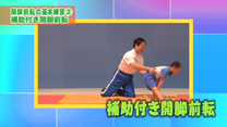 前転しながら脚を開いて、そのまま立ち上がるのが開脚前転です。 回転の勢いや脚を開くタイミングなどをしっかり身につけましょう!