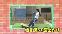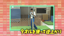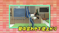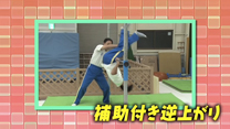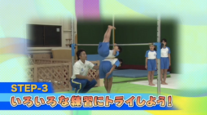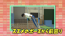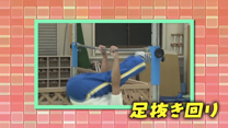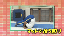 最初に、自分の身体を後ろに回転させる練習です。 座布団1枚のスペースがあれば、身体を逆さにしたり、後ろに回ったりする感覚が身に付きます。お手本は湘南とびうお体操クラブの佐藤コーチです。