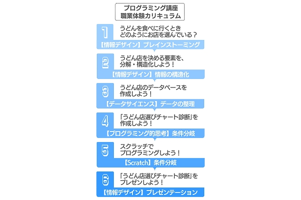 今回、参加した児童は『さぬきうどん全店制覇攻略本』(タウン情報かがわ)をデジタル化するのに協力するため、ブレインストーミングを皮切りに、情報の構造化、データの整理、条件分岐を経て、Scratch*というビジュアルプログラミング言語でプログラミングをした後、最後に自分の取り組みをプレゼンテーションするところまで行いました。