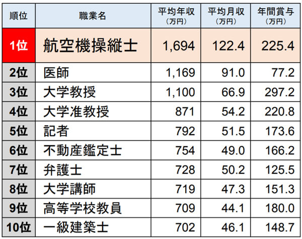 【職業別年収ランキング】気になる1位「パイロット」は月収100万超?!(年収、月収、年間賞与)